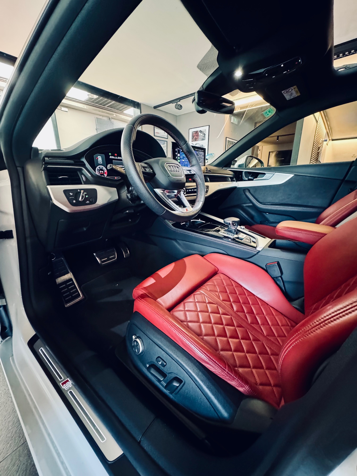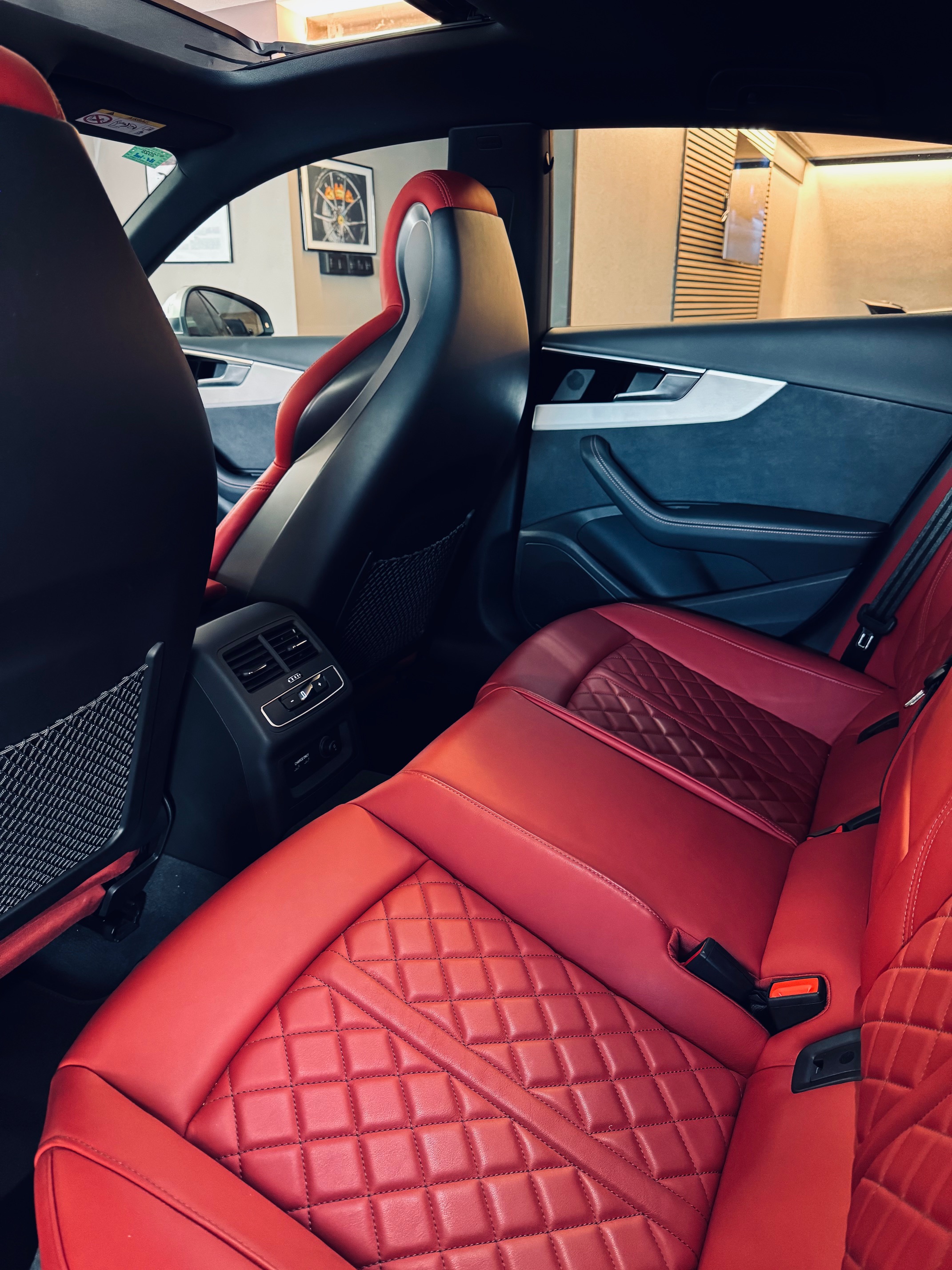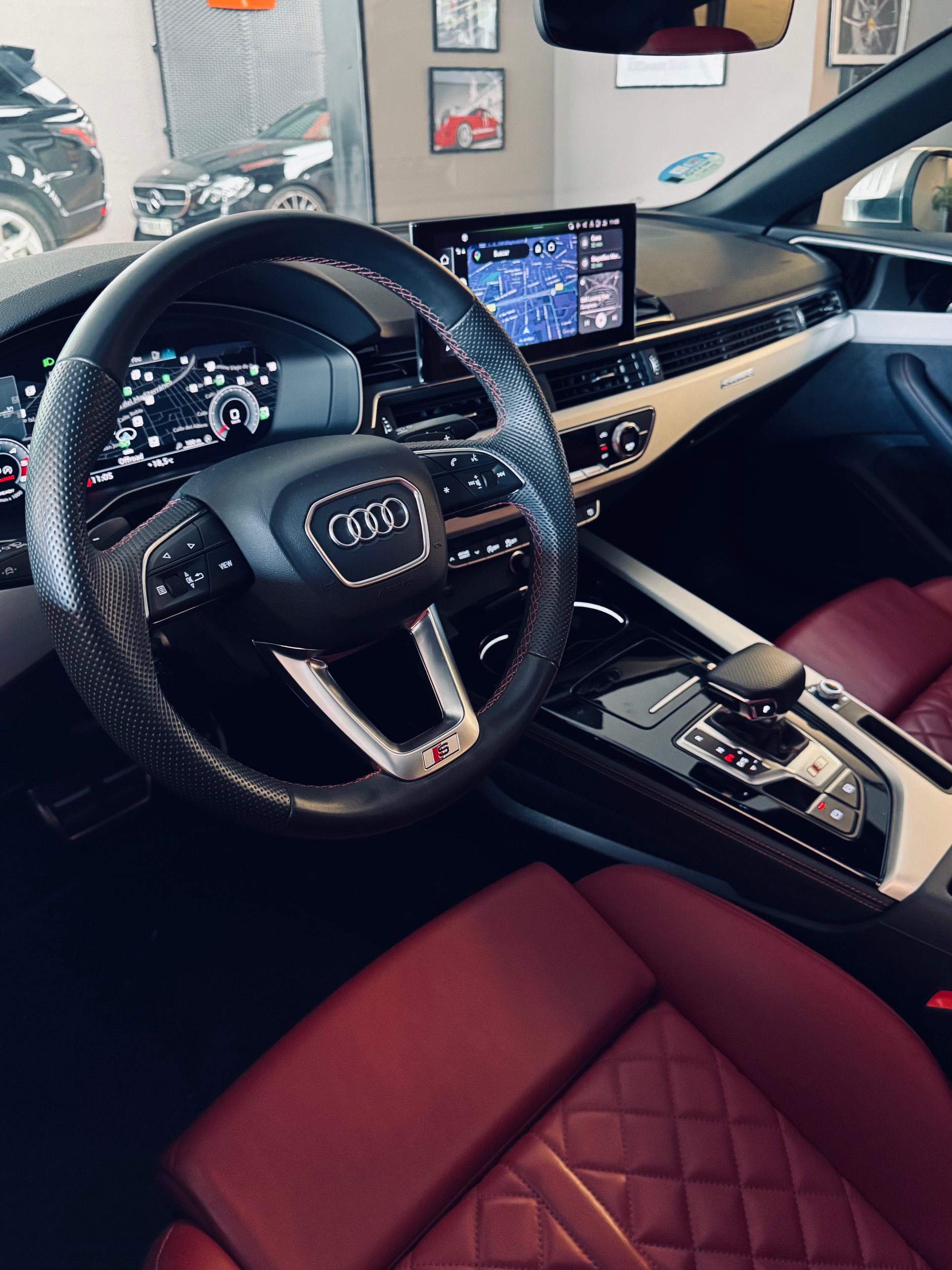 El habitáculo combina lujo y deportividad con los asientos deportivos S tapizados en cuero Napa fina, calefactables y con función memoria. Las costuras en rojo Audi Sport añaden un toque distintivo al interior, complementado por elementos en Alcantara exclusive y el acabado en cuero ampliado.